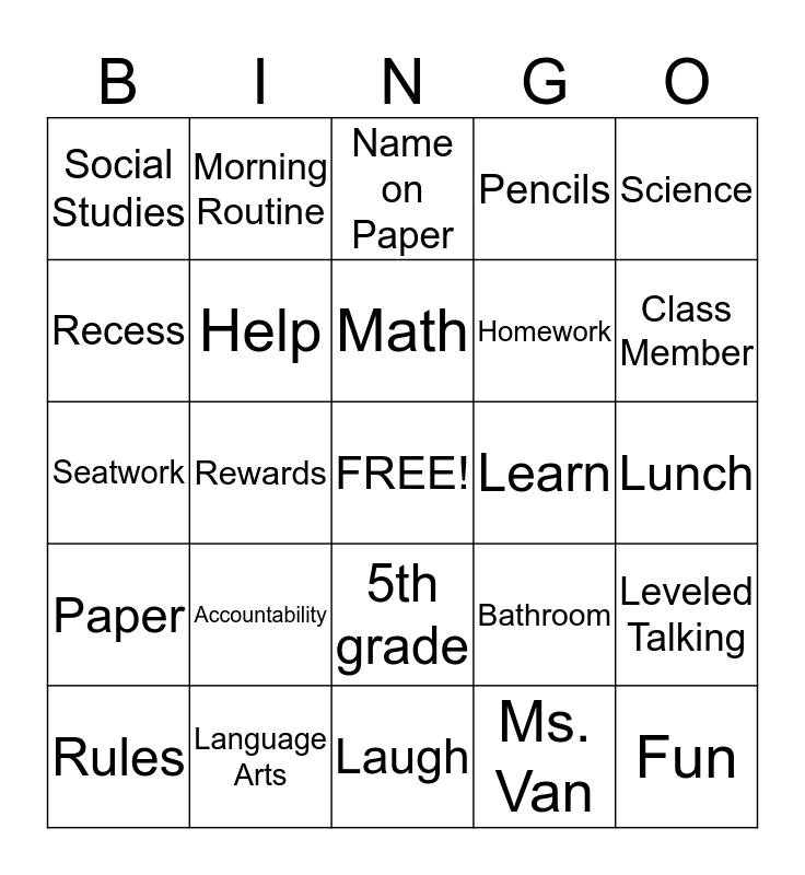 This bingo card has a free space and 26 words: 5th grade, Ms. Van, Math, Language Arts, Science, Social Studies, Recess, Morning Routine, Lunch, Bathroom, Homework, Seatwork, Leveled Talking, Rules, Rewards, Respect, Pencils, Paper, Name on Paper, Fun, Class Member, Laugh, Learn, Accountability, Help and Team player.