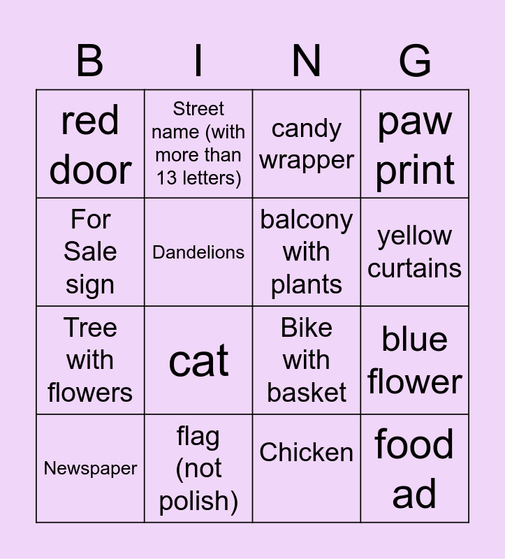 This bingo card has 16 words: flag (not polish), blue flower, candy wrapper, red door, Tree with flowers, Street name (with more than 13 letters), Bike with basket, Chicken, For Sale sign, Dandelions, Newspaper, paw print, cat, yellow curtains, balcony with plants and food ad.