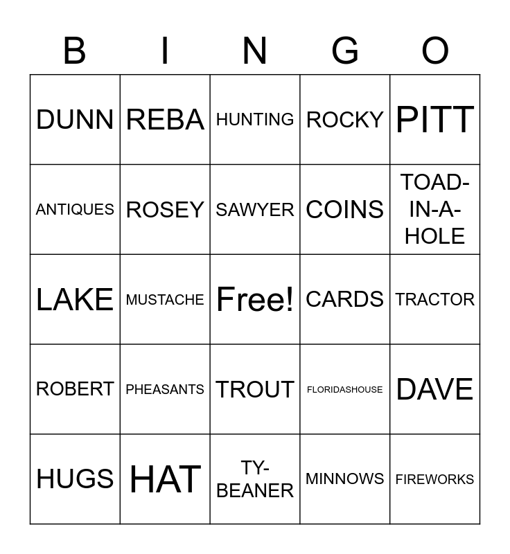 This bingo card has a free space and 75 words: DAD, STANLEY, HUNTING, FISHING, PAPA, POPS, STAN-THE-MAN, OLLIE, BOATING, DUCKS, SALMON, ELK, SAWYER, ANTIQUES, BEER, MUSTACHE, CAMPFIRE, FIREWORKS, PHILLIP, PITT, PITTLERLY, LAKE, ROSEY, REBA, ROCKY, BRUTUS, SUSU, SPEEDY, SOOCHIE, FLUFFY, MITTENS, OZZIE, DUKE, FLORIDASHOUSE, TOAD-IN-A-HOLE, COINS, STAMPS, RETIRED, TRACTOR, MINNOWS, LEACHES, O'NEIL-CREEK, DAUGHTER, SON, GRANDSON, FATHER, HUGS, DUNN, FIREPLACE, MUSKY, SUNFISH, TROUT, SUCKER, TURTLE, CATFISH, CRAPPIE, WALLEYE, PUZZLES, JOKES, RAINBOW, PHEASANTS, DEER, NEWSPAPER, RECLINER, RUMMY, CARDS, BEARD, CAMPING, MECHELE, DAVE, ROBERT, HAT, LEE, TY-BEANER and BIRDDOG.