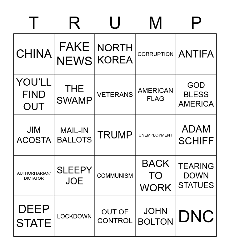 This bingo card has a free space and 69 words: NANCY PELOSI, ADAM SCHIFF, AG BARR, COVID-19/ CORONA, LOCKDOWN, QUARANTINE, CORRUPTION, DEMOCRATS, ANTIFA, RIOTS, TEARING DOWN STATUES, ECONOMY, CHINA, NORTH KOREA, VOTER ID, MAIL-IN BALLOTS, COMMUNISM, AMERICAN FLAG, NATIONAL ANTHEM, AUTHORITARIAN/ DICTATOR, UNEMPLOYMENT, BACK TO WORK, GOD BLESS AMERICA, MASK, CDC/ WHO, ELECTION, FACEBOOK/ SOCIAL MEDIA, HUUUUGE, JOHN BOLTON, TRADER, FAKE NEWS, SEATTLE/ CHAZ, BACK THE BLUE, BELIEVE ME, LAW & ORDER, NATIONAL GUARD, $BILLIONS$, TREMENDOUS, YOU’LL FIND OUT, WINNING [BIG], SLEEPY JOE, DNC, TWITTER, WEAK, MORON, DEEP STATE, *PROTESTER IS REMOVED FROM RALLY*, DIRTY COPS [FBI], POLITICAL CORRECTNESS, THE SWAMP, VETERANS, MAKE AMERICA GREAT AGAIN, KEEP AMERICA GREAT, OUT OF CONTROL, MILITARY, BIG TECH, RUSSIA, PRESS CONFERENCE, MAINSTREAM MEDIA, JIM ACOSTA, CNN, HILLARY CLINTON, VIOLENCE, BLACK LIVES MATTER, KNEELING, GEORGE WASHINGTON, THE CHINESE FLU, THE SUPREME COURT and JUSTICE ROBERTS.
