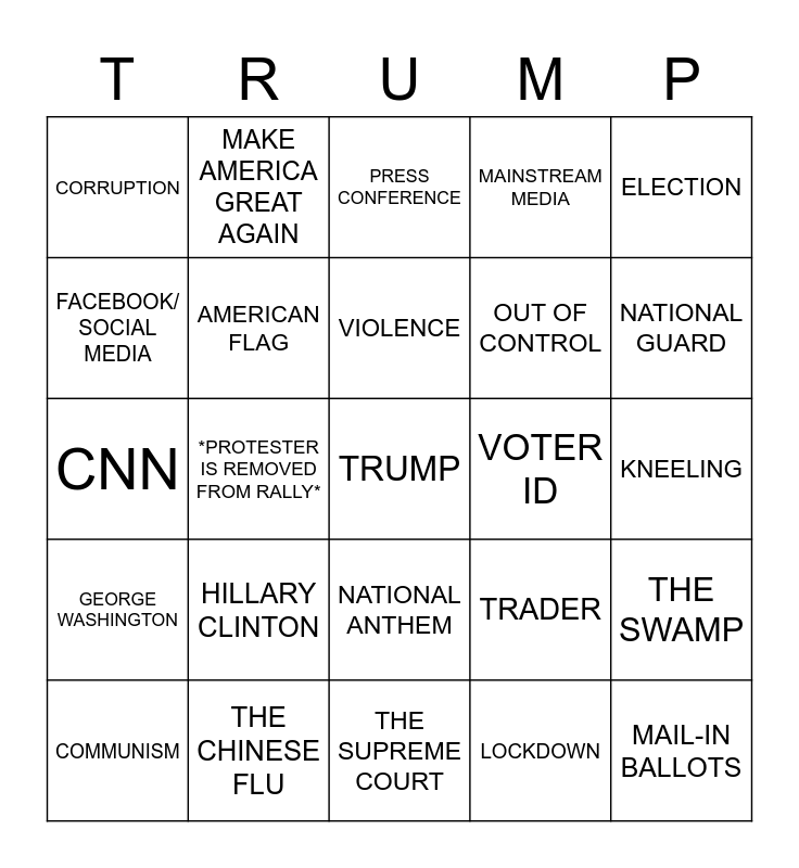 This bingo card has a free space and 69 words: DEEP STATE, *PROTESTER IS REMOVED FROM RALLY*, DIRTY COPS [FBI], POLITICAL CORRECTNESS, THE SWAMP, VETERANS, MAKE AMERICA GREAT AGAIN, KEEP AMERICA GREAT, OUT OF CONTROL, MILITARY, BIG TECH, RUSSIA, PRESS CONFERENCE, MAINSTREAM MEDIA, JIM ACOSTA, CNN, HILLARY CLINTON, VIOLENCE, BLACK LIVES MATTER, KNEELING, GEORGE WASHINGTON, THE CHINESE FLU, THE SUPREME COURT, JUSTICE ROBERTS, NANCY PELOSI, ADAM SCHIFF, AG BARR, COVID-19/ CORONA, LOCKDOWN, QUARANTINE, CORRUPTION, DEMOCRATS, ANTIFA, RIOTS, TEARING DOWN STATUES, ECONOMY, CHINA, NORTH KOREA, VOTER ID, MAIL-IN BALLOTS, COMMUNISM, AMERICAN FLAG, NATIONAL ANTHEM, DICTATOR/GOVERNOR, UNEMPLOYMENT, BACK TO WORK, GOD BLESS AMERICA, MASK, CDC/ WHO, ELECTION, FACEBOOK/ SOCIAL MEDIA, HUUUUGE, JOHN BOLTON, TRADER, FAKE NEWS, SEATTLE/ CHAZ, BACK THE BLUE, BELIEVE ME, LAW & ORDER, NATIONAL GUARD, $BILLIONS$, TREMENDOUS, YOU’LL FIND OUT, WINNING [BIG], SLEEPY JOE, DNC, TWITTER, WEAK and MORON.