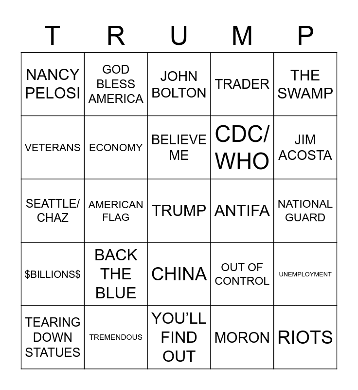 This bingo card has a free space and 69 words: COMMUNISM, AMERICAN FLAG, NATIONAL ANTHEM, DICTATOR/GOVERNOR, UNEMPLOYMENT, BACK TO WORK, GOD BLESS AMERICA, MASK, CDC/ WHO, ELECTION, FACEBOOK/ SOCIAL MEDIA, HUUUUGE, JOHN BOLTON, TRADER, FAKE NEWS, SEATTLE/ CHAZ, BACK THE BLUE, BELIEVE ME, LAW & ORDER, NATIONAL GUARD, $BILLIONS$, TREMENDOUS, YOU’LL FIND OUT, WINNING [BIG], SLEEPY JOE, DNC, TWITTER, WEAK, MORON, DEEP STATE, NANCY PELOSI, ADAM SCHIFF, AG BARR, COVID-19/ CORONA, LOCKDOWN, QUARANTINE, CORRUPTION, DEMOCRATS, ANTIFA, RIOTS, TEARING DOWN STATUES, ECONOMY, CHINA, NORTH KOREA, VOTER ID, MAIL-IN BALLOTS, *PROTESTER IS REMOVED FROM RALLY*, DIRTY COPS [FBI], POLITICAL CORRECTNESS, THE SWAMP, VETERANS, MAKE AMERICA GREAT AGAIN, KEEP AMERICA GREAT, OUT OF CONTROL, MILITARY, BIG TECH, RUSSIA, PRESS CONFERENCE, MAINSTREAM MEDIA, JIM ACOSTA, CNN, HILLARY CLINTON, VIOLENCE, BLACK LIVES MATTER, KNEELING, GEORGE WASHINGTON, THE CHINESE FLU, THE SUPREME COURT and JUSTICE ROBERTS.