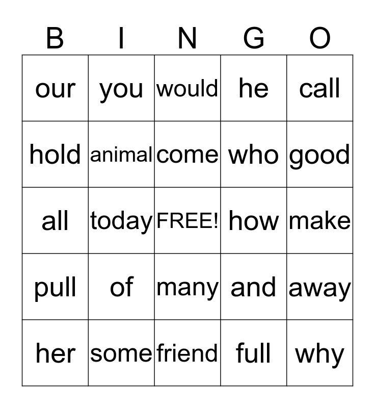 This bingo card has a free space and 29 words: her, she, today, now, our, would, animal, of, how, some, make, why, friend, full, good, hold, many, pull, call, all, and, what, who, hold, he, you, away, come and call.