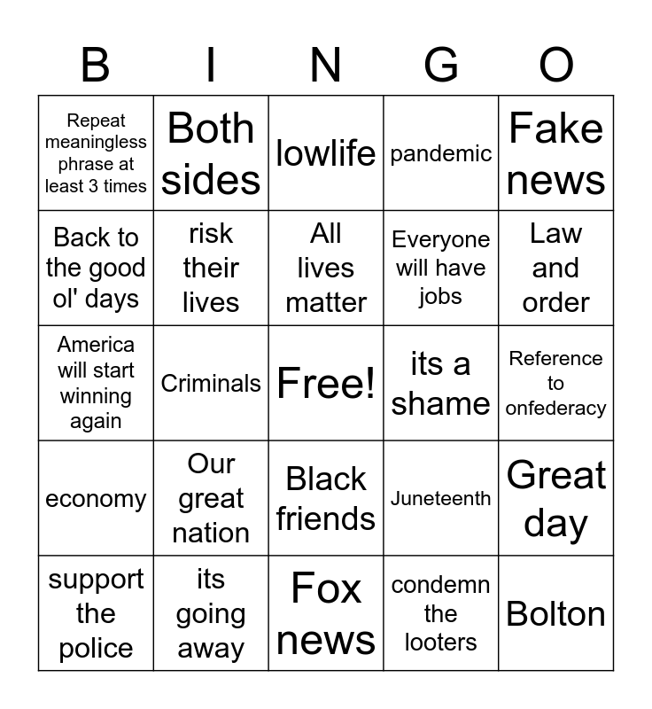 This bingo card has a free space and 24 words: Our great nation, its going away, All lives matter, support the police, Fake news, Repeat meaningless phrase at least 3 times, Back to the good ol' days, Both sides, its a shame, Black friends, Everyone will have jobs, America will start winning again, Juneteenth, Great day, risk their lives, condemn the looters, Reference to onfederacy, lowlife, Law and order, Criminals, Bolton, economy, pandemic and Fox news.