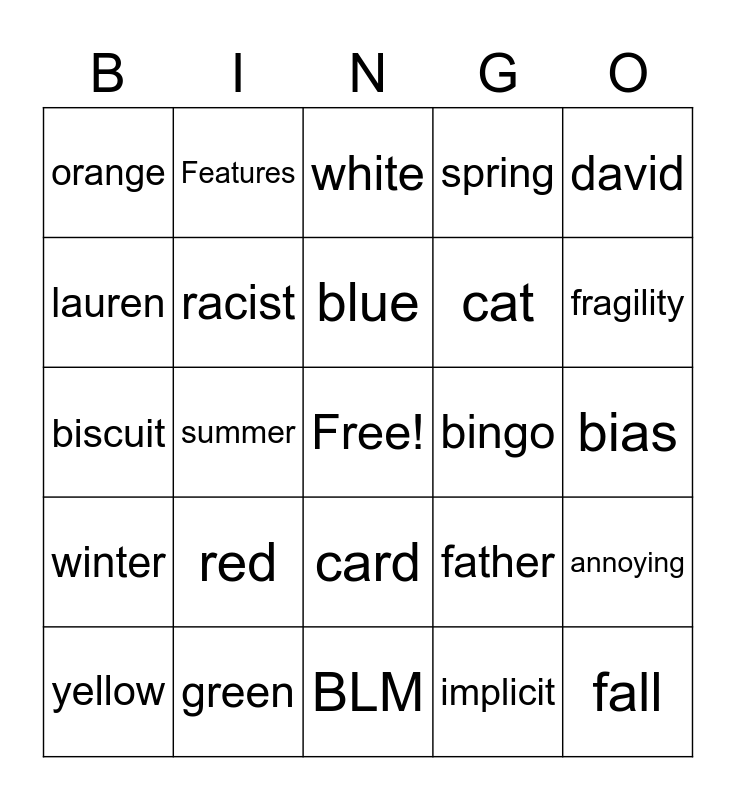 This bingo card has a free space and 24 words: red, green, blue, yellow, david, orange, lauren, Features, bingo, card, cat, biscuit, father, annoying, racist, implicit, bias, white, fragility, summer, fall, winter, spring and BLM.