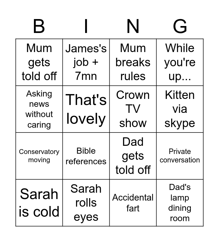 This bingo card has 16 words: Sarah rolls eyes, Private conversation, Mum breaks rules, Mum gets told off, Conservatory moving, James's job + 7mn, Dad gets told off, Accidental fart, Asking news without caring, That's lovely, Sarah is cold, While you're up..., Bible references, Kitten via skype, Crown TV show and Dad's lamp dining room.