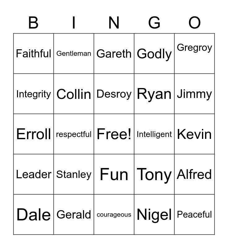 This bingo card has a free space and 24 words: Stanley, Gerald, Desroy, Dale, Gregroy, Faithful, Integrity, Gentleman, Intelligent, Fun, Ryan, Erroll, Tony, Alfred, Collin, Nigel, Kevin, Gareth, Jimmy, respectful, Peaceful, Leader, Godly and courageous.