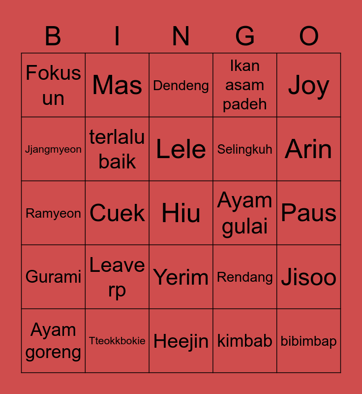 This bingo card has a free space and 24 words: Leave rp, Tteokkbokie, Lele, Ayam goreng, Joy, Fokus un, Jjangmyeon, Mas, Ayam gulai, Yerim, Selingkuh, Ramyeon, Rendang, Jisoo, terlalu baik, kimbab, Paus, Dendeng, Arin, Cuek, bibimbap, Gurami, Ikan asam padeh and Heejin.