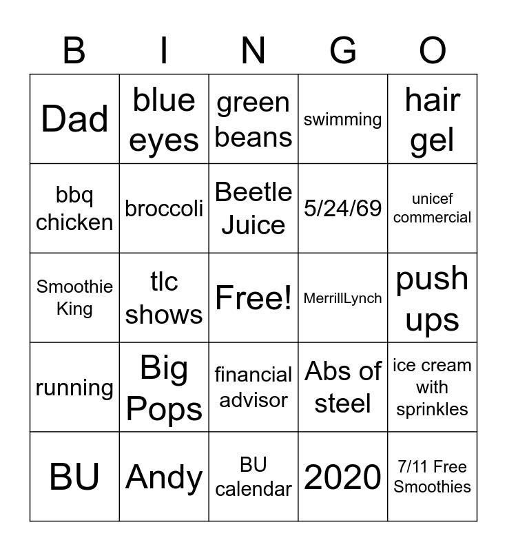 This bingo card has a free space and 24 words: Big Pops, Andy, Beetle Juice, BU, hair gel, Dad, bbq chicken, blue eyes, MerrillLynch, financial advisor, 5/24/69, Smoothie King, Abs of steel, ice cream with sprinkles, broccoli, 2020, push ups, green beans, unicef commercial, tlc shows, 7/11 Free Smoothies, running, swimming and BU calendar.