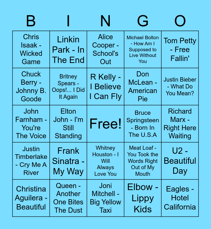 This bingo card has a free space and 84 words: Abba - Dancing Queen, Aerosmith - Walk This Way, Alice Cooper - School's Out, Andrea Bocelli - Time To Say Goodbye, Aretha Franklin - Respect, Barenkaed Ladies - Big Bang Theory, Bill Medley, Jennifer Warnes - (I've Had) The Time of My Life, Billy Joel - Uptown Girl, Blink-182 - All The Small Things, Bob Marley & The Wailers - Could You Be Loved, Bon Jovi - Livin' On A Prayer, Bonnie Tyler - Total Eclipse of The Heart, Britney Spears - Oops!... I Did It Again, Bruce Springsteen - Born In The U.S.A, Bryan Adams - Everything I Do, I Do It For You, Chris Isaak - Wicked Game, Christina Aguilera - Beautiful, Chuck Berry - Johnny B. Goode, Crash Test Dummies - Mmm Mmm Mmm Mmm, Crowded House - Weather With You, Cyndi Lauper - Girls Just Want to Have Fun, Don McLean - American Pie, Eagles - Hotel California, Ed Sheeran - Perfect, Elton John - I'm Still Standing, Eminem - My Name Is, Eric Clapton - Wonderful Tonight, Europe - The Final Countdown, Fleetwood Mac - Go Your Own Way, Foo Fighters - Learn To Fly, Frank Sinatra - My Way, Guns N' Roses - Welcome To The Jungle, John Denver - Leaving On A Jet Plane, John Farnham - You're The Voice, John Williams - E.T, John Williams - Jurassic Park, Joni Mitchell - Big Yellow Taxi, Journey - Don't Stop Believin', Justin Bieber - What Do You Mean?, Justin Timberlake - Cry Me A River, Kelly Clarkson - Since U Been Gone, Kenny Loggins - Footloose, KISS - I Was Made For Lovin' You, LeAnn Rimes - How Do I Live, Led Zeppelin - Stairway To Heaven, Les Miserables - I Dreamed A Dream, Linkin Park - In The End, Lionel Richie - Hello, Lynyrd Skynyrd - Sweet Home Alabama, Madonna - Don't Cry for Me Argentina, Marc Cohn - Walking In Memphis, Meat Loaf - You Took the Words Right Out of My Mouth, Michael Bolton - How Am I Supposed to Live Without You, Nirvana - Smells Like Teen Spirit, Phil Collins - Sussudio, PSY - Gangnam Style, Queen - Another One Bites The Dust, R Kelly - I Believe I Can Fly, Red Hot Chilli Peppers - Californication, Richard Marx - Right Here Waiting, Run DMC - Its Tricky, Spice Girls - 2 Become 1, Stevie Wonder - Supersition, Survivor - Eye of the Tiger, Take That - Back For Good, Taylor Swift - Shake It Off, The Police - Every Breath You Take, The Who - Who Are You, Tom Petty - Free Fallin', Train - Drops of Jupiter, U2 - Beautiful Day, Van Halen - Jump, Vanilla Ice - Ice Ice Baby, Wham! - Wake Me up Before You Go-Go, Whitney Houston - I Will Always Love You, Elbow - Lippy Kids, Dua Lipa - Physical, Ariana Grande - No Tears Left To Cry, Sia - Cheap Thrills, Meduza - Piece of Your Heart, The Weeknd - Blinding Lights, Ellie Goulding - Love Me Like You Do, Clean Bandit Feat. Zara Larson - Symphony and Kesha - Tik Tok.