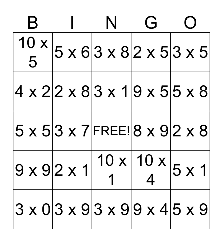 This bingo card has a free space and 24 words: 2 x 1, 3 x 9, 3 x 1, 3 x 0, 3 x 5, 10 x 5, 4 x 2, 5 x 6, 8 x 9, 10 x 1, 9 x 5, 5 x 5, 10 x 4, 5 x 1, 2 x 8, 9 x 4, 2 x 8, 3 x 8, 5 x 8, 3 x 7, 5 x 9, 9 x 9, 2 x 5 and 3 x 9.