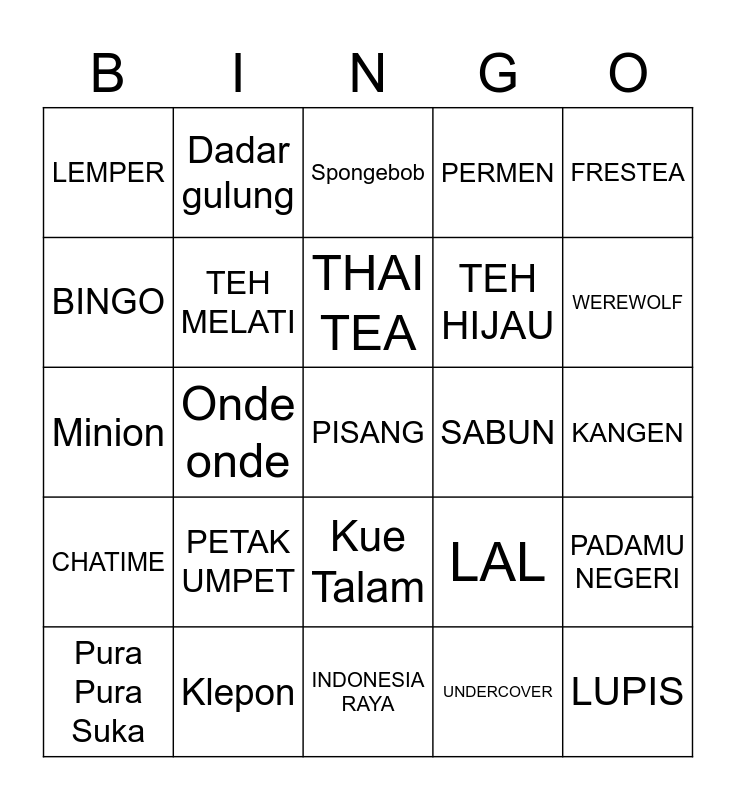 This bingo card has 25 words: PETAK UMPET, INDONESIA RAYA, THAI TEA, Pura Pura Suka, FRESTEA, LEMPER, BINGO, Dadar gulung, SABUN, Kue Talam, TEH HIJAU, Minion, LAL, PADAMU NEGERI, TEH MELATI, LUPIS, KANGEN, Spongebob, WEREWOLF, Onde onde, PISANG, Klepon, CHATIME, PERMEN and UNDERCOVER.