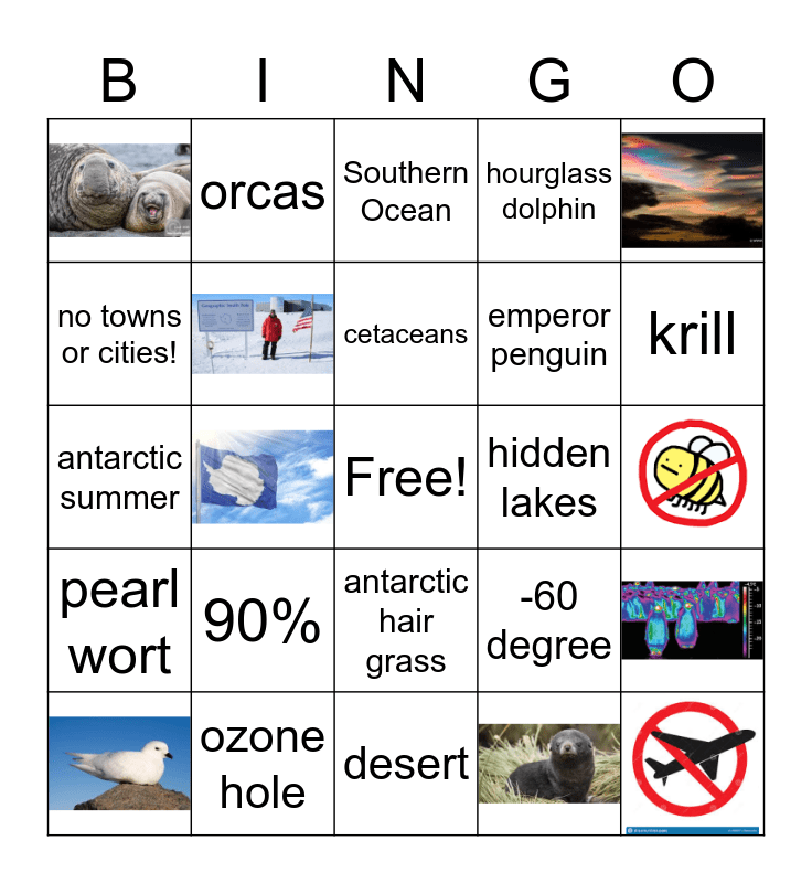 This bingo card has 11 images, a free space and 18 words: Southern Ocean, 90%, hidden lakes, ozone hole, desert, krill, nematode worm, antarctic hair grass, pearl wort, antarctic summer, -60 degree, wandering albatross, emperor penguin, no towns or cities!, hourglass dolphin, orcas, cetaceans and Extremophiles.