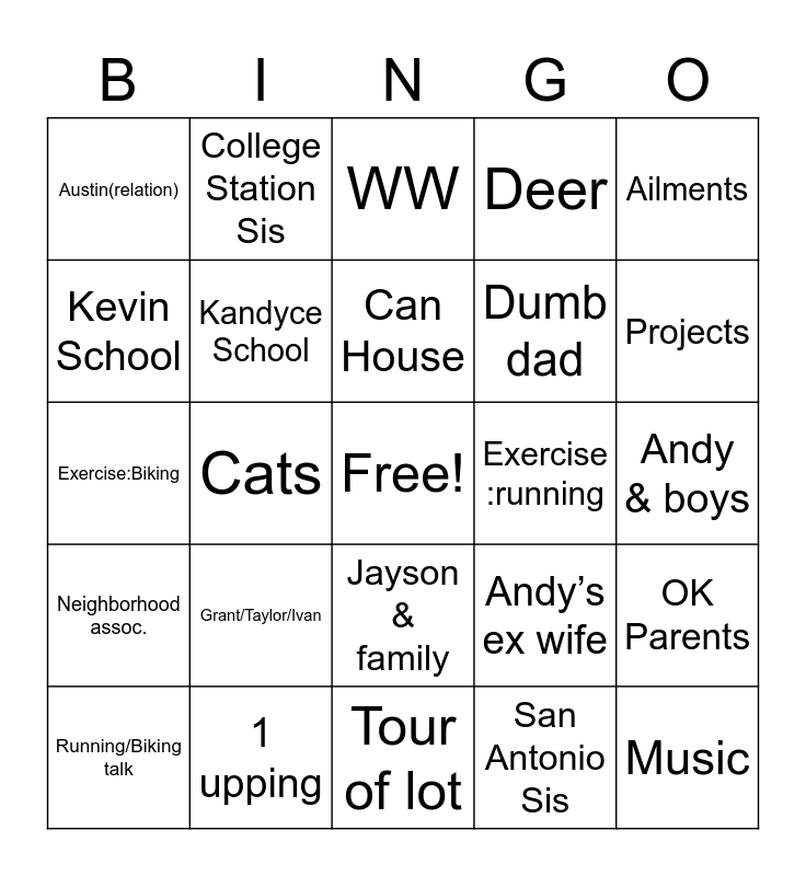 This bingo card has a free space and 24 words: Running/Biking talk, Grant/Taylor/Ivan, Can House, San Antonio Sis, Ailments, Austin(relation), College Station Sis, WW, Exercise :running, Andy & boys, Exercise:Biking, Kandyce School, Andy’s ex wife, OK Parents, Kevin School, 1 upping, Tour of lot, Deer, Projects, Neighborhood assoc., Cats, Jayson & family, Dumb dad and Music.
