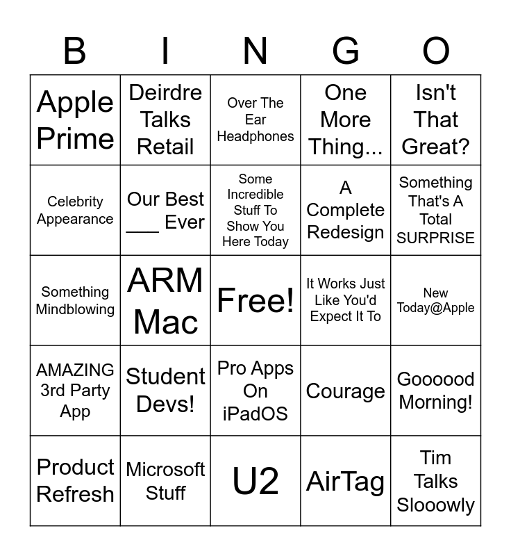 This bingo card has a free space and 50 words: Hair Force One, Tim Talks Slooowly, Jony Ive?, U2, Student Devs!, "High" Jokes, Deirdre Talks Retail, Awkward Cheering, Celebrity Appearance, Random Youtuber, Our Best ___ Ever, One More Thing..., Goooood Morning!, Courage, Revolutionary, And We're Making It Available Right Now, Some Incredible Stuff To Show You Here Today, It Works Just Like You'd Expect It To, It's Going To Look AMAZING, Isn't That Great?, ARM Mac, AirTag, Apple Prime, A Complete Redesign, AirPower, iPhoneOS 14, Something That's A Total SURPRISE, All New iMac, Over The Ear Headphones, Pro Apps On iPadOS, Lowered Prices!, Even More, New Siri Tricks!, A Game Demo, Microsoft Stuff, Google Stuff, Making Jokes About The Leaks, Update Available After Keynote!, 5 Or More Product Demos, New Today@Apple, U1 Chip!, New SDK, Cool LIDAR, Project Catalyst, Product Refresh, Something Mindblowing, Change How iPhone OS Updates Are Released, Better Performance And Stability, AMAZING 3rd Party App and Apple CarKey.