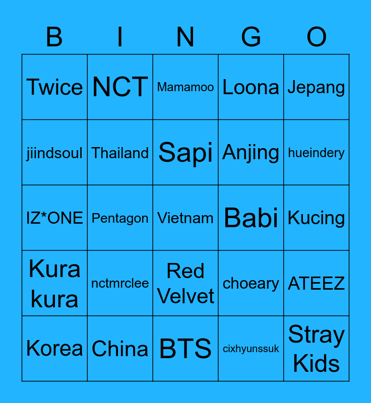This bingo card has 25 words: nctmrclee, BTS, Sapi, Korea, Jepang, Twice, jiindsoul, NCT, Babi, Red Velvet, Anjing, IZ*ONE, choeary, ATEEZ, Thailand, Stray Kids, Kucing, Mamamoo, hueindery, Pentagon, Vietnam, China, Kura kura, Loona and cixhyunssuk.