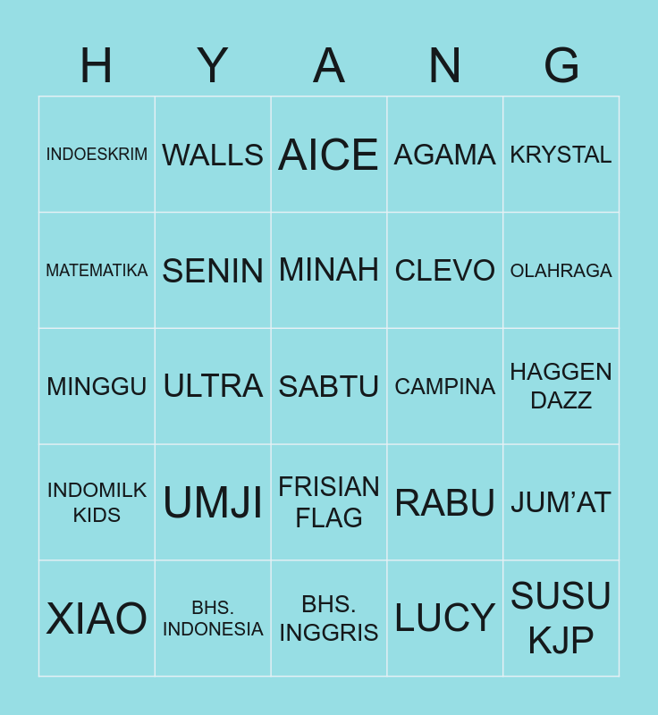 This bingo card has a free space and 24 words: XIAO, UMJI, MINAH, LUCY, KRYSTAL, INDOESKRIM, WALLS, AICE, CAMPINA, HAGGEN DAZZ, MINGGU, SENIN, RABU, JUM’AT, MATEMATIKA, BHS. INDONESIA, BHS. INGGRIS, AGAMA, OLAHRAGA, INDOMILK KIDS, ULTRA, FRISIAN FLAG, CLEVO and SUSU KJP.