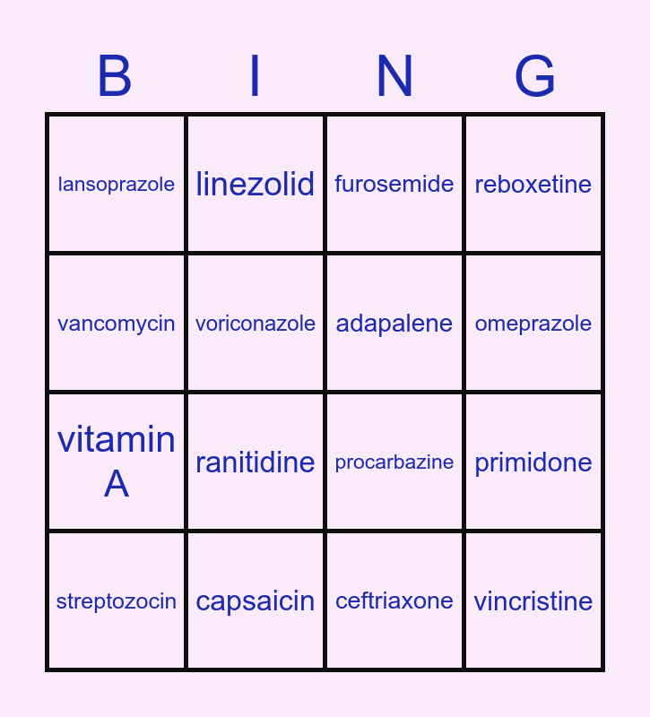 This bingo card has 99 words: fluoxetine, fluticasone, fosfomycin, furosemide, fusidic acid, gabapentin, gentamicin, glucagon, grapefruit juice, hydrocortisone, insulin, ketamine, ketoconazole, ketoprofen, lamotrigine, lansoprazole, linezolid, loratadine, lorazepam, melatonin, methotrexate, metronidazole, modafinil, nitrofurantoin, ofloxacin, olanzapine, omeprazole, orlistat, phenytoin, pholcodine, phosphate, pizotifen, prasugrel, prednisolone, primidone, procarbazine, propofol, quetiapine, quinapril, rabies vaccine, ramipril, ranitidine, reboxetine, risperidone, ritonavir, rituximab, rivaroxaban, senna, sertraline, simvastatin, soybean oil, streptozocin, temazepam, terbinafine, tetracycline, theophylline, thiamine, tigecycline, tiotropium, topiramate, travoprost, trimethoprim, tryptophan, urea (13C), valsartan, vancomycin, varenicline, vasopressin, venlafaxine, vincristine, vinorelbine, vitamin A, voriconazole, zopiclone, zuclopenthixol, aciclovir, adapalene, adenosine, aflibercept, alcohol, capsaicin, captopril, carbamazepine, carbocisteine, carboplatin, caspofungin, cefalexin, cefradine, ceftriaxone, estriol, etanercept, ethosuximide, etodolac, etoposide, fentanyl, exenatide, famotidine, febuxostat and felodipine.