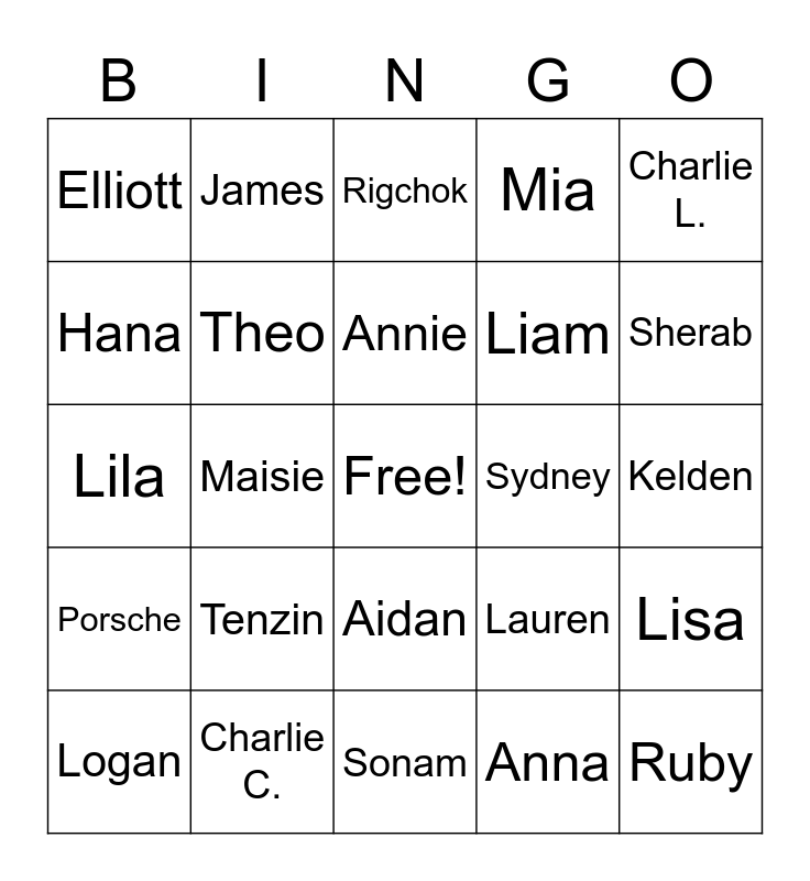 This bingo card has a free space and 26 words: Aidan, Anna, Annie, Charlie C., Charlie L., Elliott, Hana, James, Kelden, Lauren, Liam, Lila, Lisa, Logan, Maisie, Maya, Mia, Porsche, Rigchok, Ruby, Sherab, Sonam, Sydney, Tenzin, Theo and Zoe.