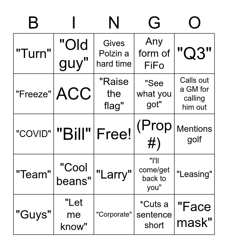 This bingo card has a free space and 24 words: "Cool beans", "Let me know", "Raise the flag", "Guys", "Q3", "Turn", "Freeze", "Old guy", (Prop #), "Larry", "See what you got", "COVID", "I'll come/get back to you", "Leasing", ACC, *Cuts a sentence short, Mentions golf, Gives Polzin a hard time, Calls out a GM for calling him out, "Bill", "Face mask", "Team", Any form of FiFo and "Corporate".