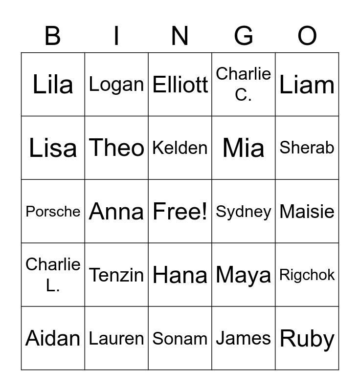 This bingo card has a free space and 26 words: Hana, James, Kelden, Lauren, Liam, Lila, Lisa, Logan, Maisie, Maya, Mia, Porsche, Rigchok, Aidan, Anna, Annie, Charlie C., Charlie L., Elliott, Ruby, Sherab, Sonam, Sydney, Tenzin, Theo and Zoe.
