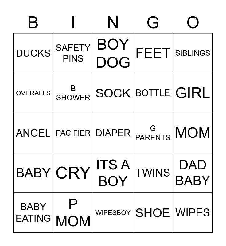 This bingo card has 25 words: CRY, WIPESBOY, SOCK, BABY EATING, SIBLINGS, DUCKS, OVERALLS, SAFETY PINS, G PARENTS, ITS A BOY, BOTTLE, ANGEL, TWINS, DAD BABY, B SHOWER, WIPES, MOM, BOY DOG, GIRL, PACIFIER, DIAPER, P MOM, BABY, FEET and SHOE.