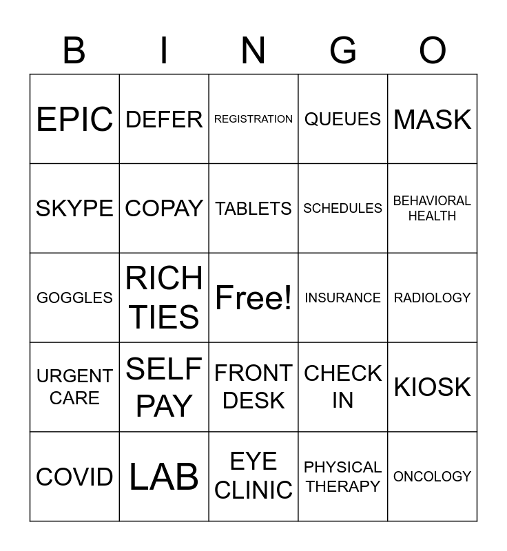 This bingo card has a free space and 29 words: COVID, AIDET, RICH TIES, ACESS, EPIC, REGISTRATION, COPAY, SELF PAY, INSURANCE, LAB, RADIOLOGY, ONCOLOGY, EYE CLINIC, PHYSICAL THERAPY, BEHAVIORAL HEALTH, CTS, FRONT DESK, URGENT CARE, MASK, GOGGLES, CHECK IN, DAR, SCHEDULES, SKYPE, QUEUES, DEFER, KIOSK, TABLETS and INBASKET.
