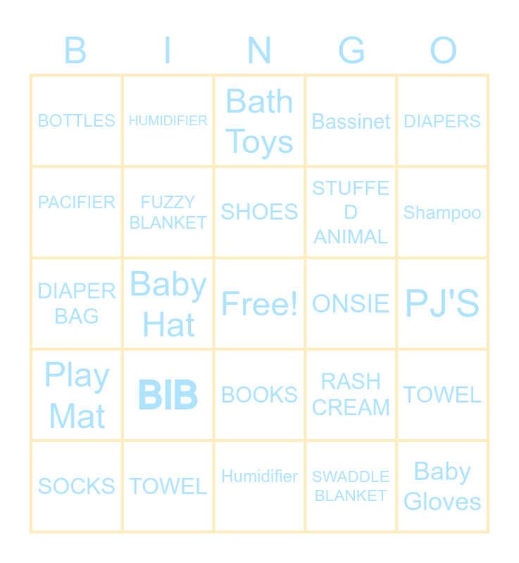 This bingo card has a free space and 24 words: BIB, TOWEL, SHOES, SOCKS, DIAPERS, BOTTLES, PACIFIER, HUMIDIFIER, ONSIE, BOOKS, STUFFE D ANIMAL, DIAPER BAG, RASH CREAM, TOWEL, FUZZY BLANKET, SWADDLE BLANKET, PJ'S, Bath Toys, Shampoo, Baby Hat, Baby Gloves, Play Mat, Bassinet and Humidifier.