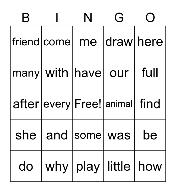 This bingo card has a free space and 25 words: and, play, have, do, here, friend, many, come, animal, some, our, after, was, be, with, he, find, me, full, every, how, why, she, draw and little.