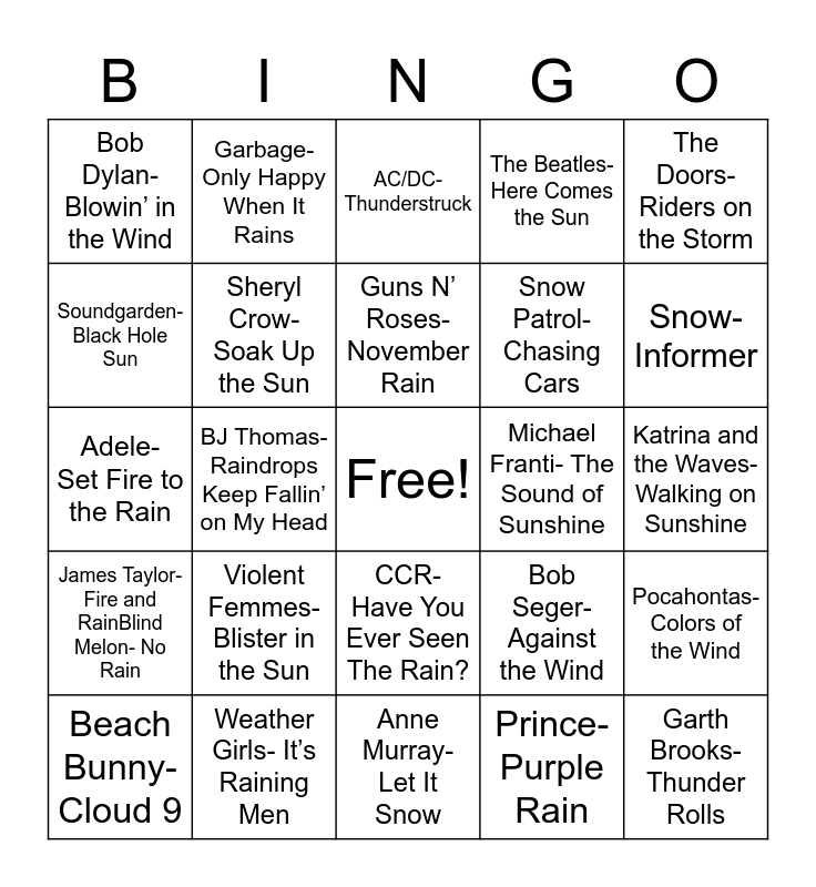 This bingo card has a free space and 26 words: CCR- Have You Ever Seen The Rain?, Prince- Purple Rain, Guns N’ Roses- November Rain, Weather Girls- It’s Raining Men, The Doors- Riders on the Storm, Bob Dylan- Blowin’ in the Wind, Soundgarden- Black Hole Sun, Garbage- Only Happy When It Rains, Katrina and the Waves- Walking on Sunshine, Bob Seger- Against the Wind, Snow Patrol- Chasing Cars, Adele- Set Fire to the Rain, Pocahontas- Colors of the Wind, Beach Bunny- Cloud 9, BJ Thomas- Raindrops Keep Fallin’ on My Head, Will Ferrel- Dust in the Wind, The Beatles- Here Comes the Sun, James Taylor- Fire and RainBlind Melon- No Rain, AC/DC- Thunderstruck, Garth Brooks- Thunder Rolls, Snow- Informer, Anne Murray- Let It Snow, Michael Franti- The Sound of Sunshine, Violent Femmes- Blister in the Sun, Sheryl Crow- Soak Up the Sun and Elvis Presley- Kentucky Rain.