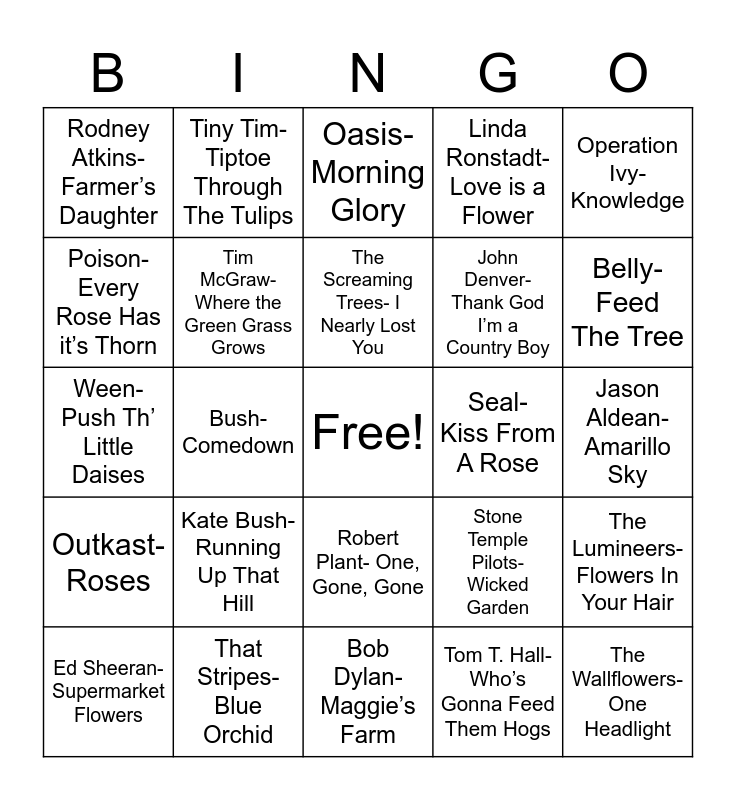 This bingo card has a free space and 27 words: Stone Temple Pilots- Wicked Garden, Savage Garden- Truly Madly Deeply, John Denver- Thank God I’m a Country Boy, Bob Dylan- Maggie’s Farm, Poison- Every Rose Has it’s Thorn, Oasis- Morning Glory, Tiny Tim- Tiptoe Through The Tulips, Outkast- Roses, Seal- Kiss From A Rose, The Lumineers- Flowers In Your Hair, Ween- Push Th’ Little Daises, Linda Ronstadt- Love is a Flower, Ed Sheeran- Supermarket Flowers, That Stripes- Blue Orchid, Belly- Feed The Tree, Kenny Chesney- She Think’s My Tractor’s Sexy, Tim McGraw- Where the Green Grass Grows, The Screaming Trees- I Nearly Lost You, Kate Bush- Running Up That Hill, Rodney Atkins- Farmer’s Daughter, Jason Aldean- Amarillo Sky, Tom T. Hall- Who’s Gonna Feed Them Hogs, Bush- Comedown, The Wallflowers- One Headlight, Robert Plant- One, Gone, Gone, Operation Ivy- Knowledge and Brandon Flowers- Flamingo.