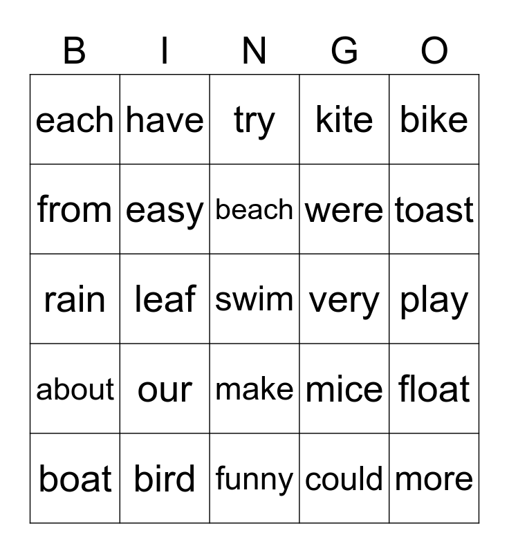 This bingo card has a free space and 24 words: our, bird, beach, boat, bike, each, from, have, very, make, were, rain, mice, float, easy, could, play, try, toast, leaf, more, about, kite and funny.