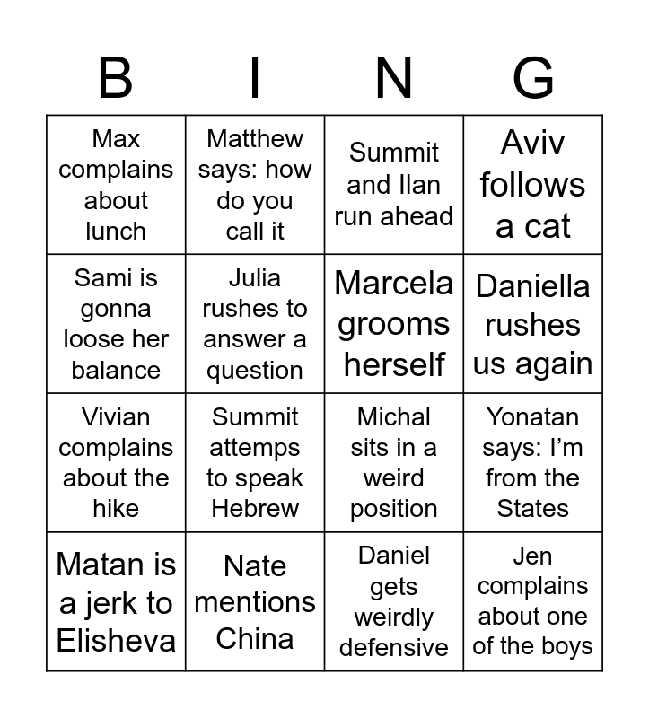 This bingo card has 16 words: Nate mentions China, Yonatan says: I’m from the States, Summit and Ilan run ahead, Max complains about lunch, Vivian complains about the hike, Matthew says: how do you call it, Michal sits in a weird position, Daniel gets weirdly defensive, Sami is gonna loose her balance, Julia rushes to answer a question, Matan is a jerk to Elisheva, Aviv follows a cat, Summit attemps to speak Hebrew, Daniella rushes us again, Marcela grooms herself and Jen complains about one of the boys.