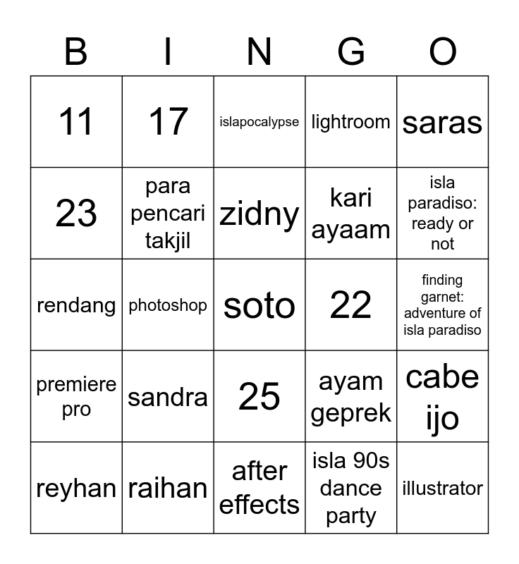 This bingo card has a free space and 24 words: sandra, raihan, zidny, reyhan, saras, 11, 23, 17, 22, 25, kari ayaam, rendang, ayam geprek, cabe ijo, para pencari takjil, isla 90s dance party, finding garnet: adventure of isla paradiso, islapocalypse, isla paradiso: ready or not, photoshop, illustrator, premiere pro, lightroom and after effects.