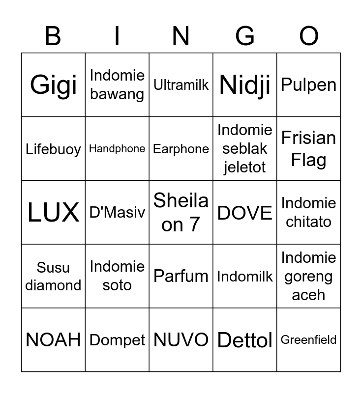 This bingo card has a free space and 24 words: Indomie soto, Dompet, Earphone, NOAH, Pulpen, Gigi, Lifebuoy, Indomie bawang, DOVE, Parfum, Indomie seblak jeletot, LUX, Indomilk, Indomie goreng aceh, Handphone, Dettol, Indomie chitato, Ultramilk, Frisian Flag, D'Masiv, Greenfield, Susu diamond, Nidji and NUVO.