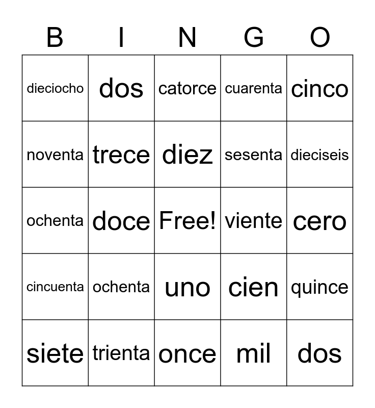 This bingo card has a free space and 24 words: ochenta, trienta, diez, siete, cinco, dieciocho, noventa, dos, viente, uno, sesenta, ochenta, cien, quince, trece, mil, cero, catorce, dieciseis, doce, dos, cincuenta, cuarenta and once.