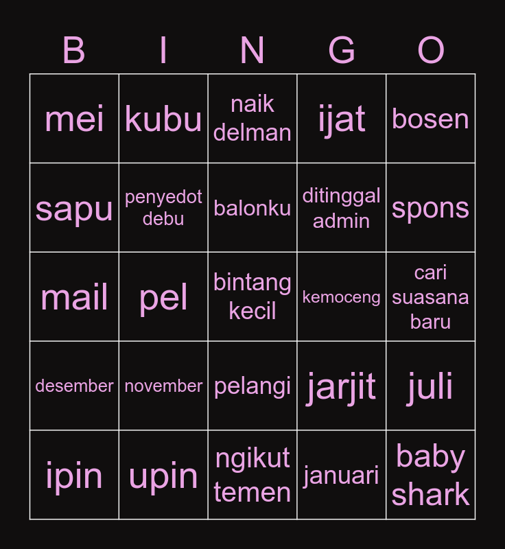 This bingo card has a free space and 24 words: november, upin, balonku, ipin, bosen, mei, sapu, kubu, kemoceng, pelangi, ditinggal admin, mail, jarjit, juli, penyedot debu, januari, cari suasana baru, naik delman, spons, pel, baby shark, desember, ijat and ngikut temen.