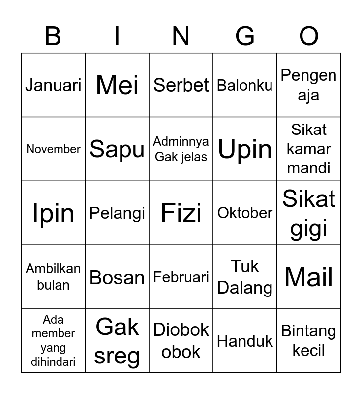 This bingo card has a free space and 24 words: Bosan, Gak sreg, Adminnya Gak jelas, Ada member yang dihindari, Pengen aja, Januari, November, Mei, Oktober, Februari, Upin, Ipin, Tuk Dalang, Mail, Sapu, Handuk, Sikat gigi, Serbet, Sikat kamar mandi, Pelangi, Bintang kecil, Ambilkan bulan, Balonku and Diobok obok.