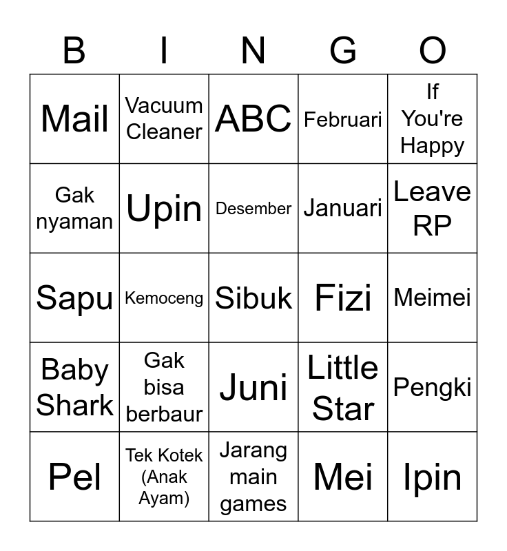 This bingo card has a free space and 24 words: Gak bisa berbaur, Tek Kotek (Anak Ayam), Desember, Pel, If You're Happy, Mail, Gak nyaman, Vacuum Cleaner, Fizi, Juni, Januari, Sapu, Little Star, Pengki, Upin, Mei, Meimei, ABC, Leave RP, Kemoceng, Ipin, Baby Shark, Februari and Jarang main games.