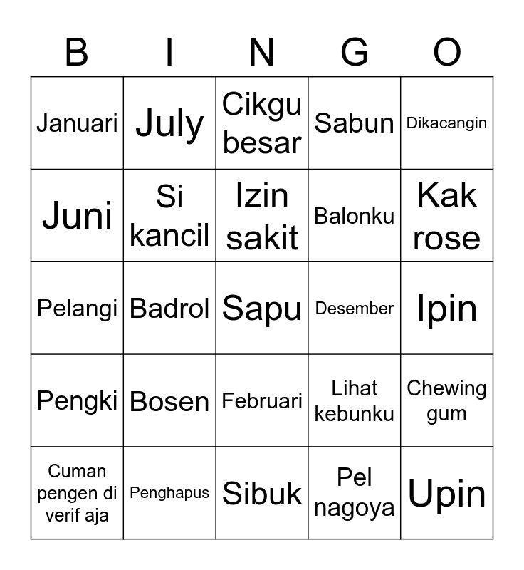 This bingo card has 25 words: Bosen, Sibuk, Izin sakit, Cuman pengen di verif aja, Dikacangin, Januari, Juni, July, Desember, Februari, Balonku, Pelangi, Lihat kebunku, Chewing gum, Si kancil, Upin, Ipin, Cikgu besar, Kak rose, Badrol, Sapu, Penghapus, Pengki, Sabun and Pel nagoya.