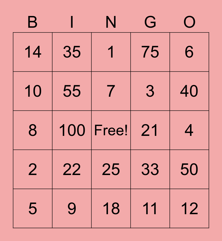This bingo card has a free space and 24 words: 5, 22, 7, 11, 6, 14, 35, 1, 21, 4, 8, 55, 33, 50, 10, 9, 18, 75, 40, 2, 100, 25, 3 and 12.