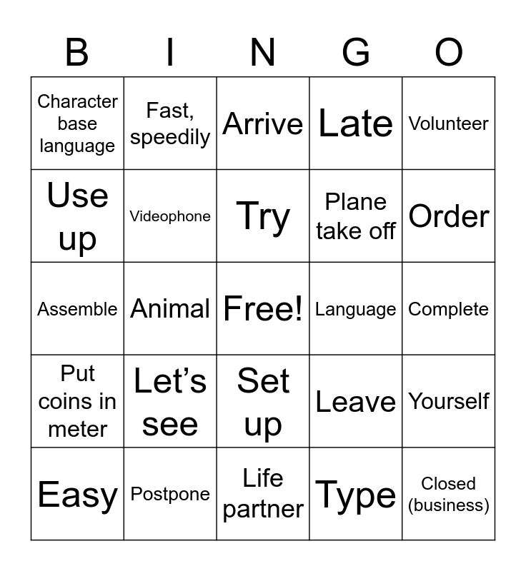 This bingo card has a free space and 37 words: Enthusiastic, Instructions, Why not, Videophone, Yourself, Let’s see, Try, Don’t mind, Volunteer, Feed (animals), Animal, Late, Closed (business), Complete, Use up, Put coins in meter, Go with, Arrive, Set up, Language, Character base language, Order, Easy, Life partner, Quickly, Type, Fast, speedily, Slow, Don’t know, Use, Plan, Postpone, Assemble, Lose, Leave, Plane take off and Show up.