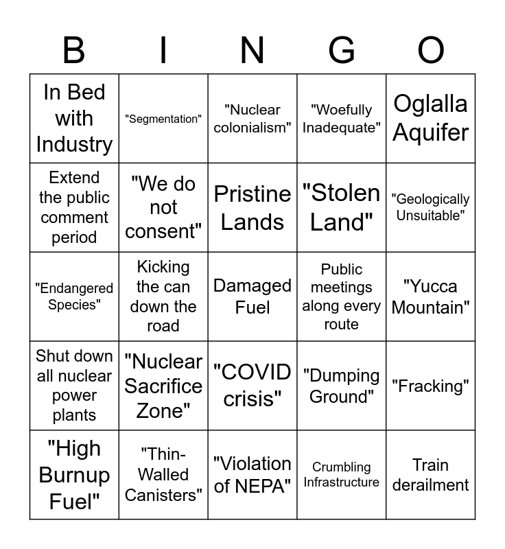 This bingo card has 40 words: "Fukushima Freeway", "Endangered Species", Bury it under the White House, "We do not consent", "Thin-Walled Canisters", "COVID crisis", Pristine Lands, "Environmental Racism", Oglalla Aquifer, Shut down all nuclear power plants, Kicking the can down the road, "Woefully Inadequate", Damaged Fuel, "Yucca Mountain", Public meetings along every route, "Nuclear Sacrifice Zone", No dose is acceptable, In Bed with Industry, "Mobile Chernobyl", "Nuclear colonialism", "Fracking", Crumbling Infrastructure, "Stolen Land", Extend the public comment period, "Environmental Injustice", "De Facto Disposal", Illegal proposal, Accident at WIPP, Train derailment, Leaking Canisters, Thank you, Kevin, "High Burnup Fuel", "Hardened Onsite Storage", "Dumping Ground", "Geologically Unsuitable", "Violation of NEPA", "Down-winders", "Are you out of your minds?", "Segmentation" and "Nuclear Waste Dump".