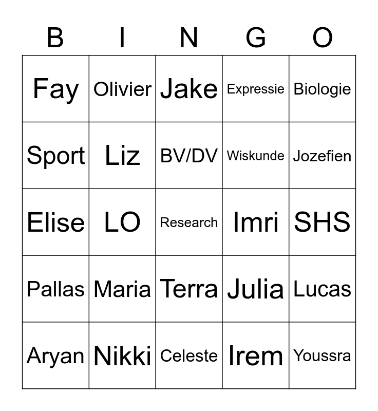 This bingo card has 38 words: pauze, samen, gezellig, Liz, Lucas, Maria, BV/DV, NASK, Biologie, Wiskunde, LO, Expressie, Research, SHS, Sport, Pallas, Ramon, Jake, Luuk, Imri, Fay, Nikki, Jozefien, Aryan, Tygo, Celeste, Youssra, Hibaq, Justin, Cagla, Milan, Terra, Irem, Olivier, Esmée, Julia, Elise and Mees.