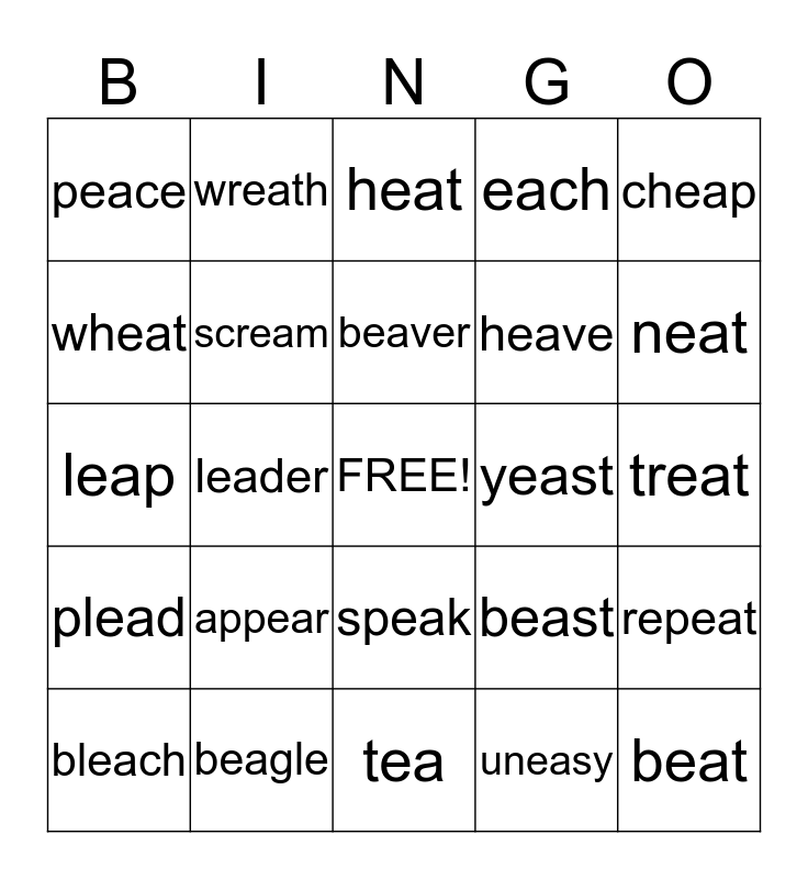 This bingo card has a free space and 24 words: appear, beagle, beaver, bleach, cheap, peace, wheat, wreath, yeast, speak, heave, leap, beast, repeat, scream, uneasy, treat, heat, neat, leader, beat, plead, each and tea.