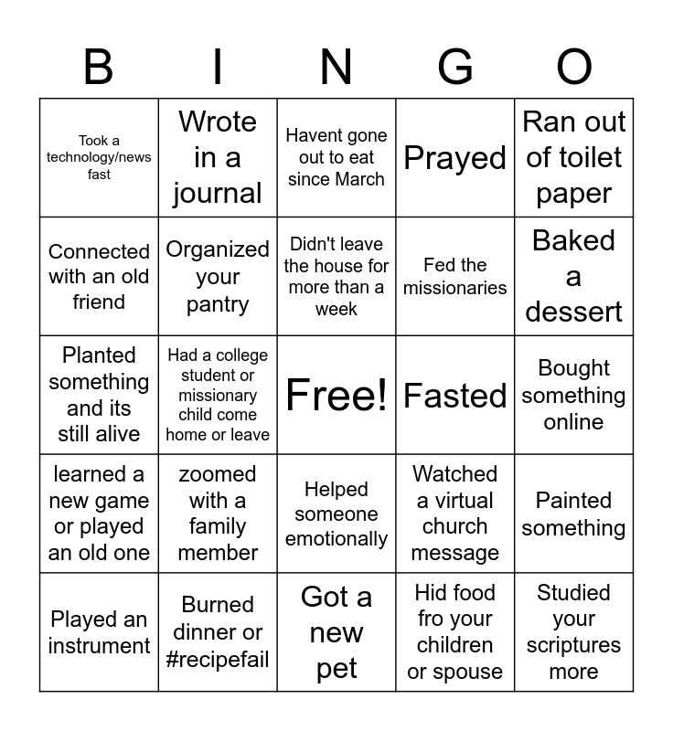 This bingo card has a free space and 29 words: Played an instrument, Has a 72 hour kit of food, medicine and water, Had a college student or missionary child come home or leave, Didn't kill anyone, Took a technology/news fast, Havent gone out to eat since March, Organized your pantry, zoomed with a family member, Fasted, Burned dinner or #recipefail, Bought something online, Studied your scriptures more, Got a new pet, Hid food fro your children or spouse, Baked a dessert, Ate food storage, Helped someone emotionally, learned a new game or played an old one, Ran out of toilet paper, Planted something and its still alive, Watched a virtual church message, cut your own hair, Fed the missionaries, Connected with an old friend, Prayed, Wrote in a journal, Painted something, Didn't leave the house for more than a week and Met some new neighbors.