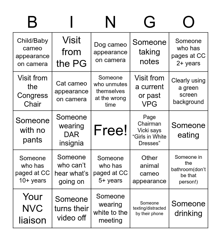 This bingo card has a free space and 31 words: Someone wearing white to the meeting, Someone wearing Larry’s security pin, Someone wearing DAR insignia, Adult Family member/Roommate cameo appearance on camera, Child/Baby cameo appearance on camera, Dog cameo appearance on camera, Cat cameo appearance on camera, Other animal cameo appearance, Page Chairman Vicki says “Girls in White Dresses”, Someone texting/distracted by their phone, Someone eating, Someone drinking, Someone walking, Someone outside, Clearly using a green screen background, Someone in front of a completely blank wall, Someone in the bathroom(don’t be that person!), Someone who can’t hear what’s going on, Someone who has paged at CC 10+ years, Someone who has paged at CC 5+ years, Someone who has pages at CC 2+ years, Someone brand new to paging at CC, Your NVC liaison, Visit from the PG, Visit from a current or past VPG, Visit from the Congress Chair, Someone taking notes, Someone with no pants, Someone turns their video off, Someone who unmutes themselves at the wrong time and Page Chairman Vicki says “Page Session Verification Form".