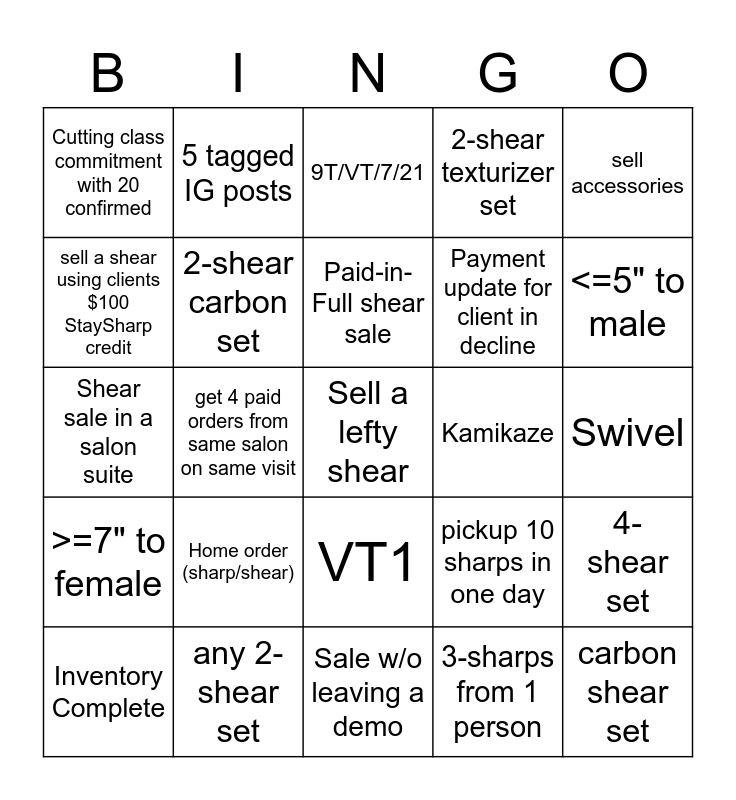 This bingo card has 26 words: VT1, 3-sharps from 1 person, Paid-in-Full shear sale, any 2-shear set, sell accessories, Cutting class commitment with 20 confirmed, sell a shear using clients $100 StaySharp credit, 5 tagged IG posts, Swivel, pickup 10 sharps in one day, Payment update for client in decline, Shear sale in a salon suite, 4-shear set, Inventory Complete, get 4 paid orders from same salon on same visit, Cold sale (w/o demo'ing), 2-shear texturizer set, >=7" to female, 9T/VT/7/21, Sell a lefty shear, <=5" to male, Sale w/o leaving a demo, Kamikaze, Home order (sharp/shear), 2-shear carbon set and carbon shear set.