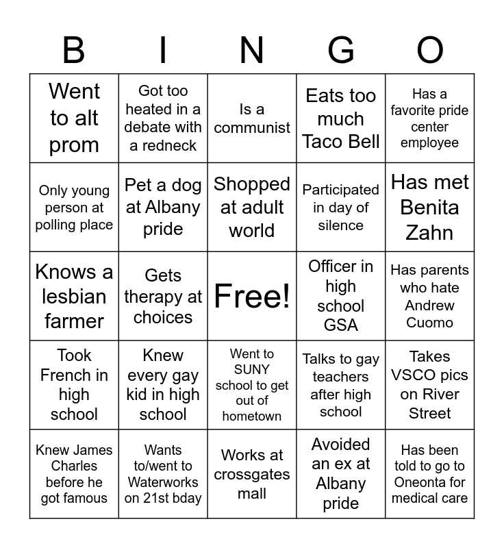 This bingo card has a free space and 24 words: Knew every gay kid in high school, Wants to/went to Waterworks on 21st bday, Shopped at adult world, Knew James Charles before he got famous, Has a favorite pride center employee, Went to alt prom, Only young person at polling place, Got too heated in a debate with a redneck, Officer in high school GSA, Went to SUNY school to get out of hometown, Participated in day of silence, Knows a lesbian farmer, Talks to gay teachers after high school, Takes VSCO pics on River Street, Pet a dog at Albany pride, Avoided an ex at Albany pride, Has parents who hate Andrew Cuomo, Is a communist, Has met Benita Zahn, Gets therapy at choices, Has been told to go to Oneonta for medical care, Took French in high school, Eats too much Taco Bell and Works at crossgates mall.