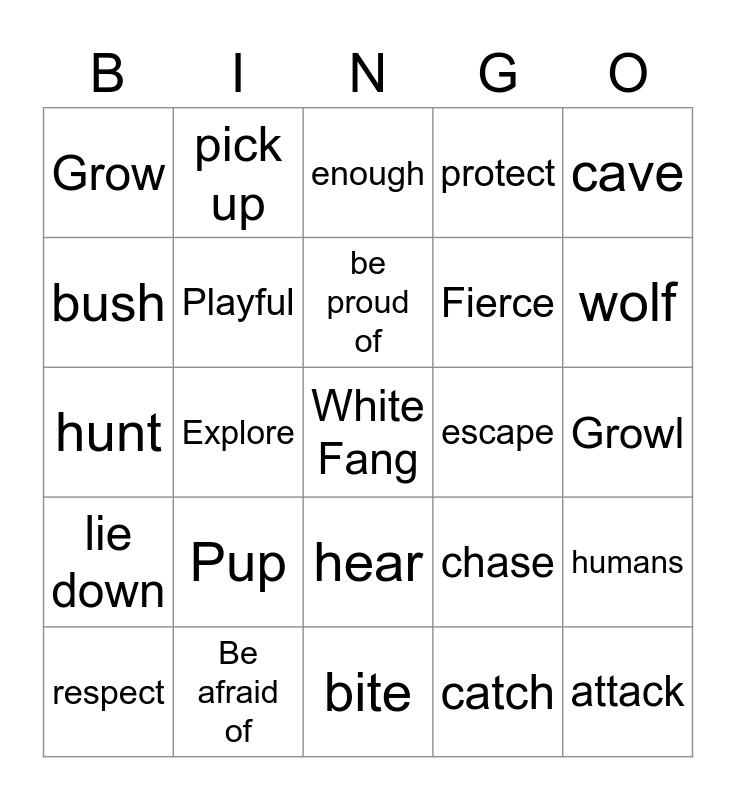 This bingo card has a free space and 24 words: Pup, Be afraid of, be proud of, respect, cave, Grow, bush, pick up, escape, hear, Fierce, hunt, chase, humans, Playful, catch, Growl, enough, wolf, Explore, attack, lie down, protect and bite.
